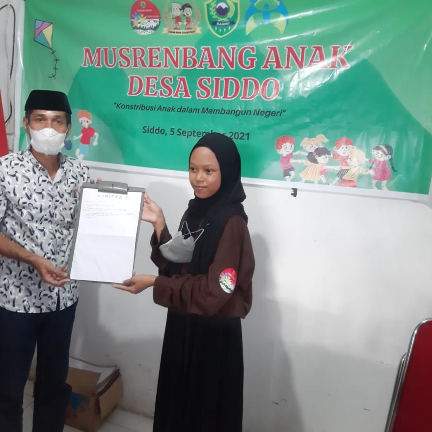 SIDDO - Pelaksanaan Muserenbang Anak Tahun 2021 dilaksanakan oleh Forum Anak Desa Siddo yang di fasilitasi oleh Pemerintah Desa Siddo dan di Pandu oleh Forum Anak Kecamatan dan Forum Anak Colliq Fujie Kabupaten Barru berlangsung dengan penuh antusias dari anak-anak yang berasal dari 4 dusun di Desa Siddo, Dihadiri oleh Bapak Ir. H. Abdul Sami Sekertaris DPMD, PPKB, PPPA dalam sambutannya menyampaikan bahwa pembangunan didesa dilakukan secara berjenjang sudah seharusnya Forum Anak Desa memanfaatkan momen Musrenbang Anak sebaik-baiknya sebagai wadah dalam menjaring aspirasi anak di desa untuk selanjutnya diteruskan ke jenjang selanjutnya yaitu Musrenbang Desa dalam rangka penyusunan RKPDesa, senada dengan Kepala Desa Siddo dalam sambutannya sekaligus membuka acara menyampaikan keseriusan Pemerintah Desa Siddo dalam Pembangunan Anak karena anak merupakan generasi penerus yang akan melanjutkan pembangunan di desa.